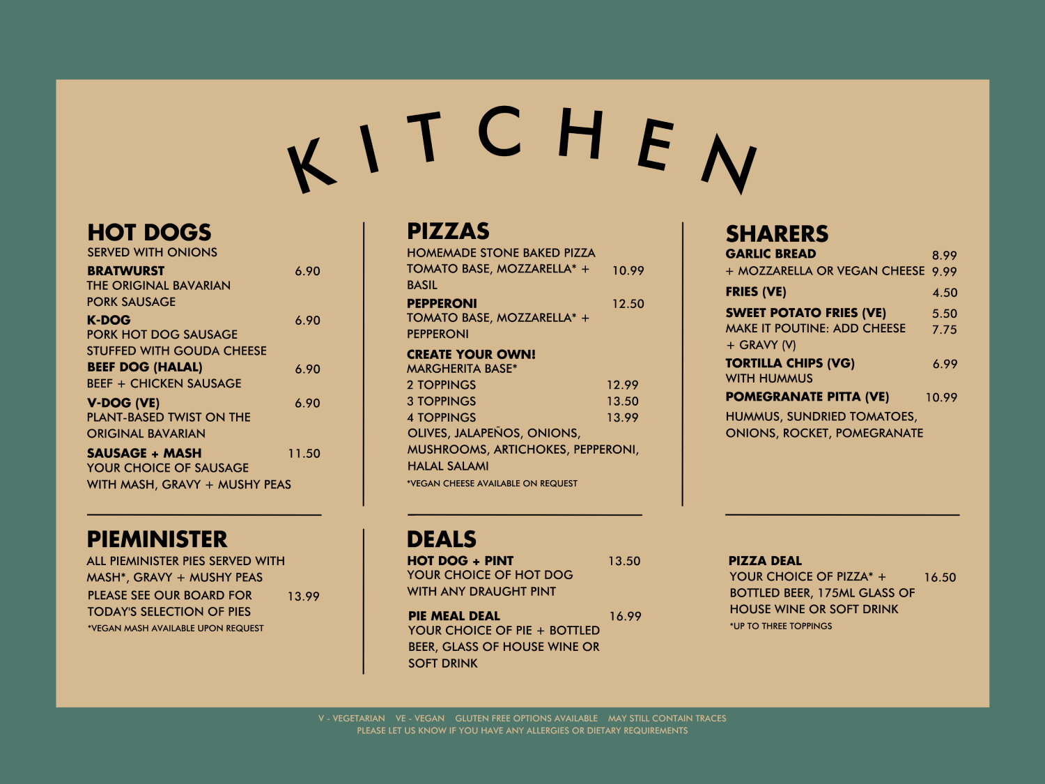 Head upstairs to see our team in the kitchen. We’ll happily serve you up a Pieminister Pie with mash, mushy peas and gravy, or if you prefer a freshly made pizza, you can create your own! Check out our menu below.